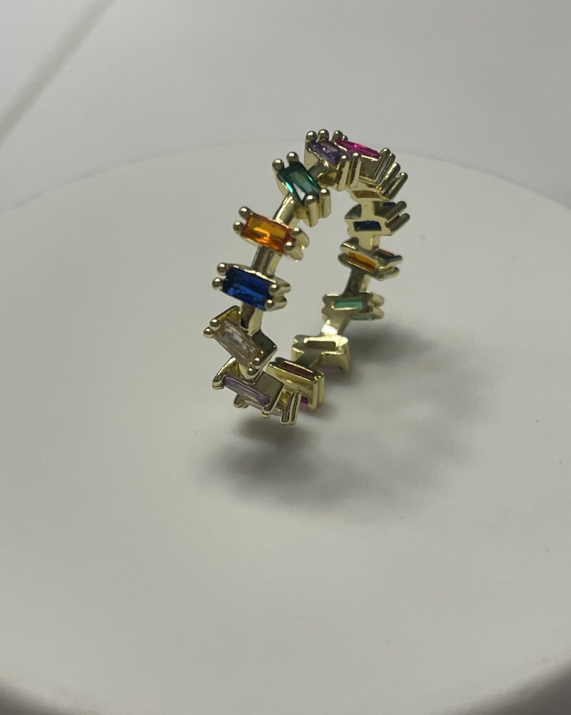 Anello placcato oro con pietre di zirconia cubica colorate.