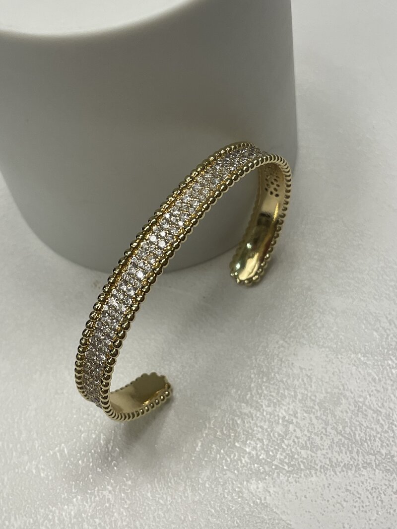 Bracciale rigido, aperto, in acciaio inossidabile placcato oro 18kt con pavè solo anteriore di brillante cubic zirconia.