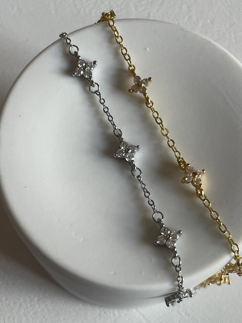 Braccialetto Flowers placcato oro con fiori realizzati in pietre di lucente e brillante cubic zirconia. Disponibile nella versione gold o silver. Regolabile.
