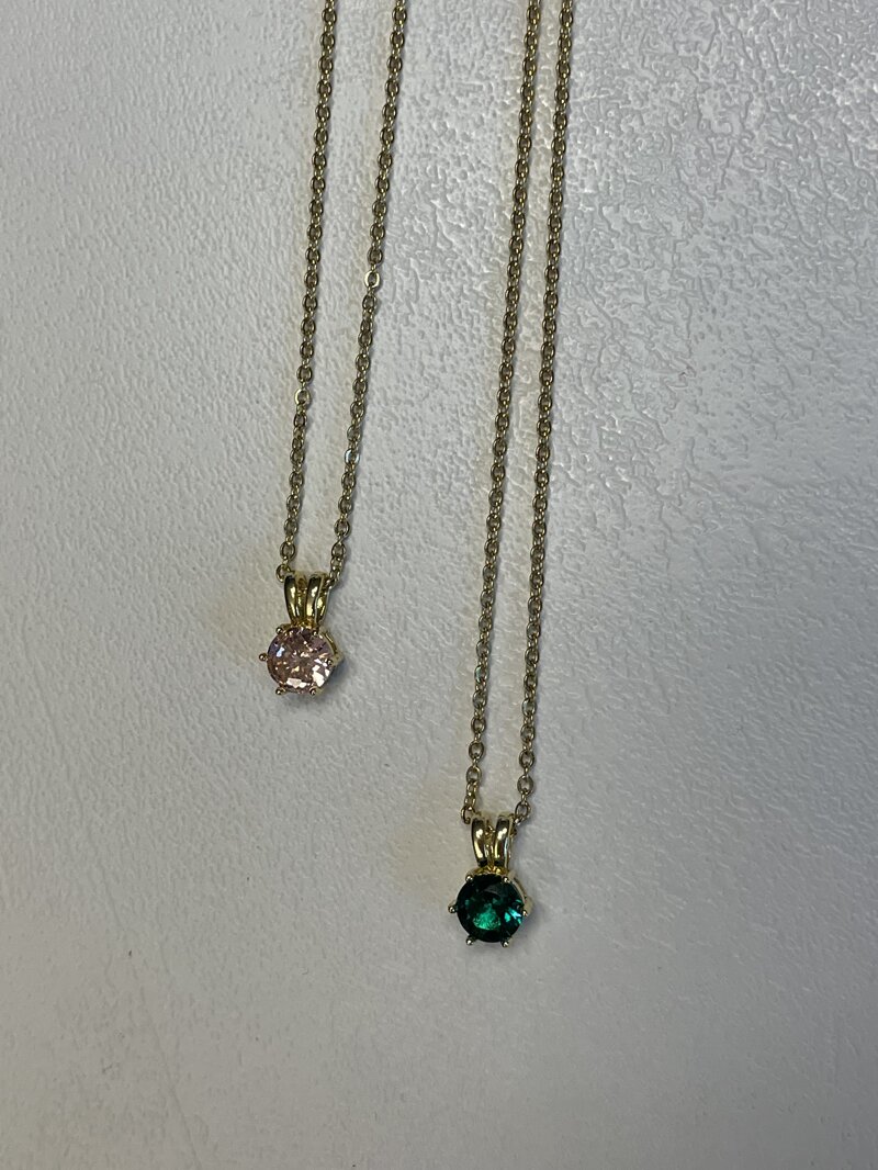 Collana Modello Iris in acciaio inossidabile ipoallergenico 316L dorata con pendente in zirconia cubica dalla massima lucentezza disponibile nella versione rosa o verde.
