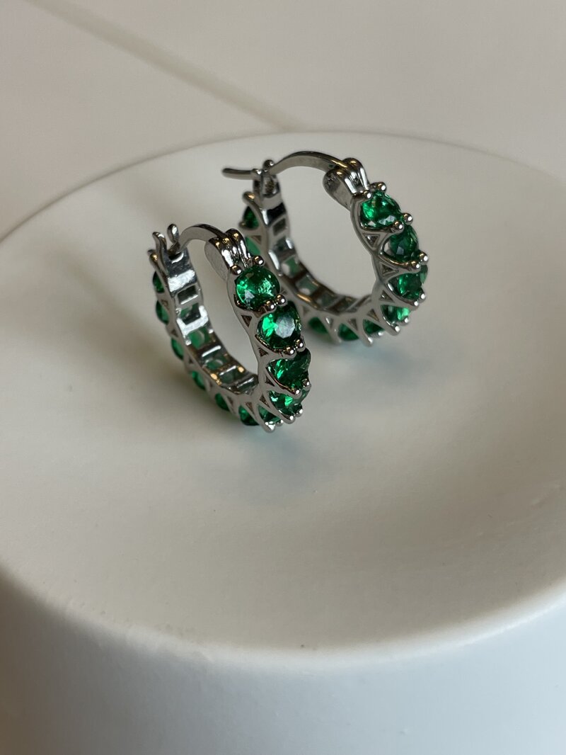 Orecchini a cerchietto placcati oro con montatura a giorno e pietre verdi di cubic zirconia.