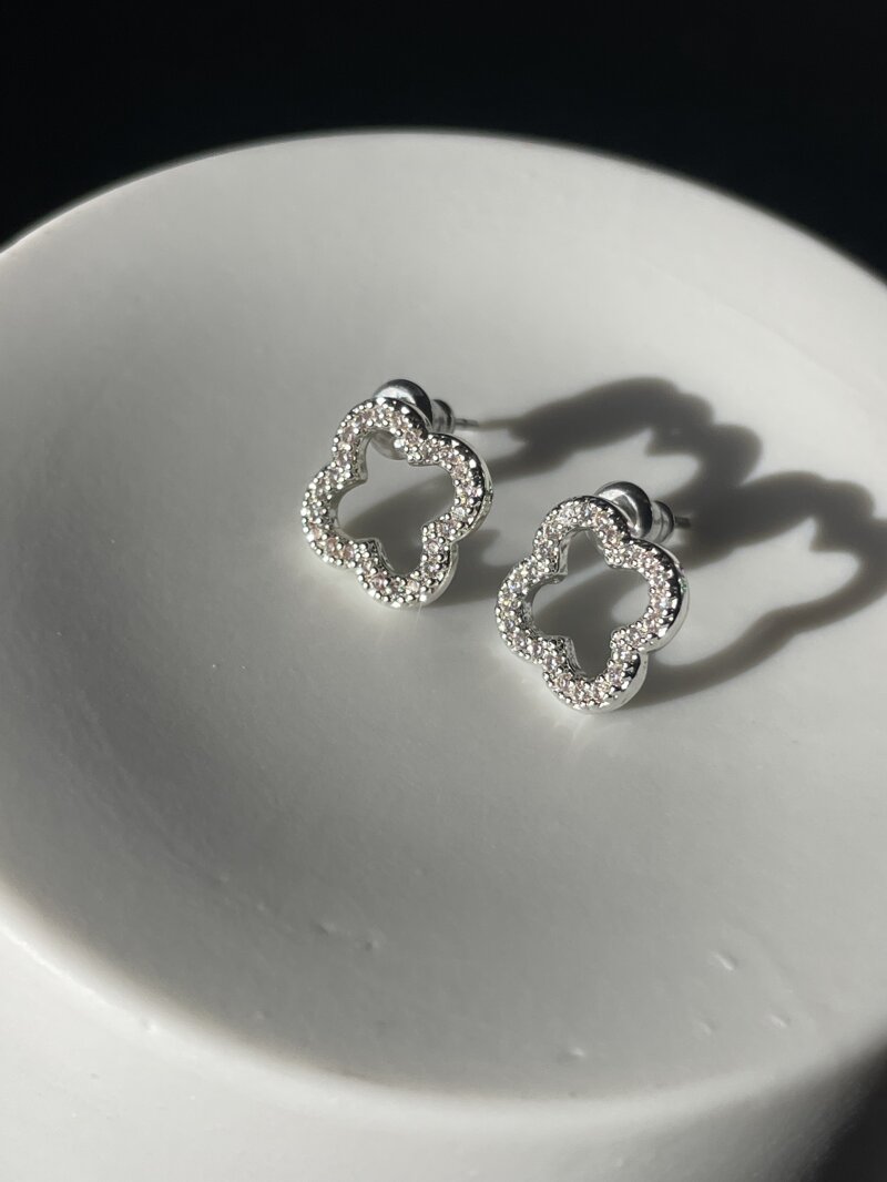 Orecchini Quadrifoglio a lobo, color argenteo con luminosissime piccole pietre di zirconia cubica che rendono l'oggetto elegante e splendente.
