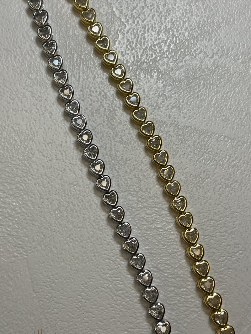 Tennis placcato oro, disponibile nella versione gold o silver, con pietre di cubic zirconia a taglio a cuore. Lunghezza del bracciale 19 cm. Chiusura a scomparsa e alette laterali.