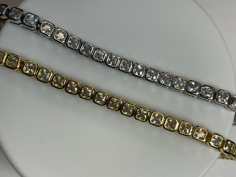 Tennis placcato oro, disponibile nella finitura silver o gold, con montatura quadrata e pietre di zirconia cubica. Chiusura a scomparsa e alette laterali. Lunghezza del bracciale 19 cm.